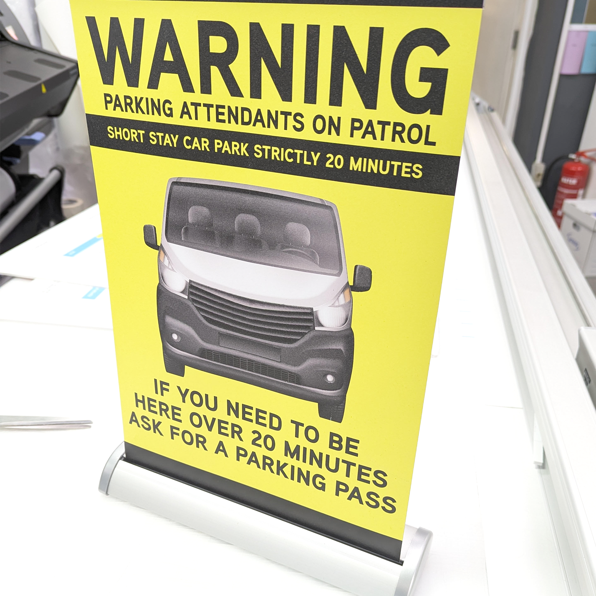 Get noticed fast with our same day roller banners, printed in vibrant full colour on durable 410gsm stay-flat stock for a smooth, professional finish.